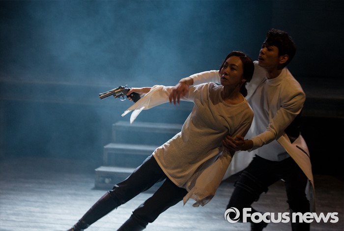 (서울=포커스뉴스) 4일 오후 서울 중구 충무아트센터에서 열린 연극 '햄릿-더 플레이' 언론시연회에 참석한 배우 이진희(왼쪽), 김지휘가 열연하고 있다.