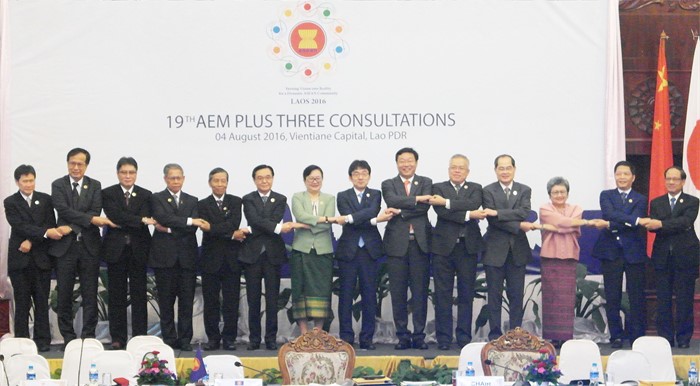 (서울=포커스뉴스) 주형환(오른쪽 여섯 번째) 산업통상자원부 장관이 4일(현지시간) 라오스 비엔티안 돈 찬 팰리스호텔에서 열린 제19회 ASEAN+3 경제장관회의에 참석해 기념촬영을 하고 있다. <사진제공=산업통상자원부>