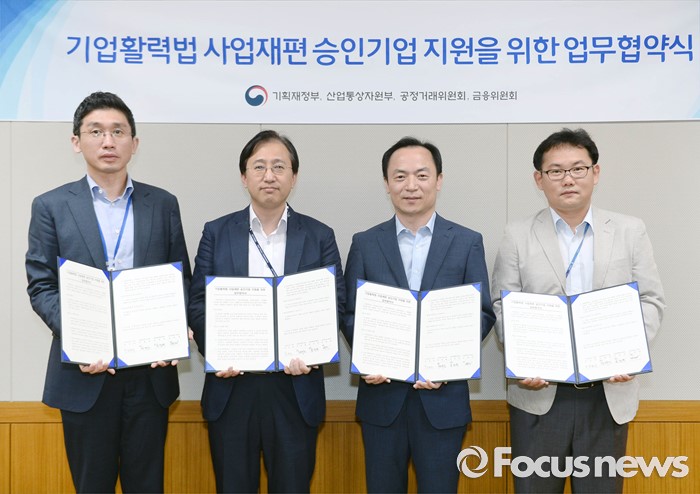 (세종=포커스뉴스) 정대진(오른쪽 두 번째) 산업통상자원부 창의산업정책관이 4일 오후 세종시 정부세종청사 산업부 회의실에서 기획재정부 정책조정총괄과장, 공정거래위원회 시장구조개선과장, 금융위원회 산업금융과장이 참석한 가운데 ‘4개 부처는 오는 8월13일 시행 예정인 기업활력 제고를 위한 특별법(이하 기활법)의 원활한 운영 및 사업재편기업에 대한 효과적인 지원’을 위해 '기업활력법 사업재편 기업지원 업무협약 체결식'을 갖고 기념촬영 하고 있다. <사진제공=산업통상자원부>
