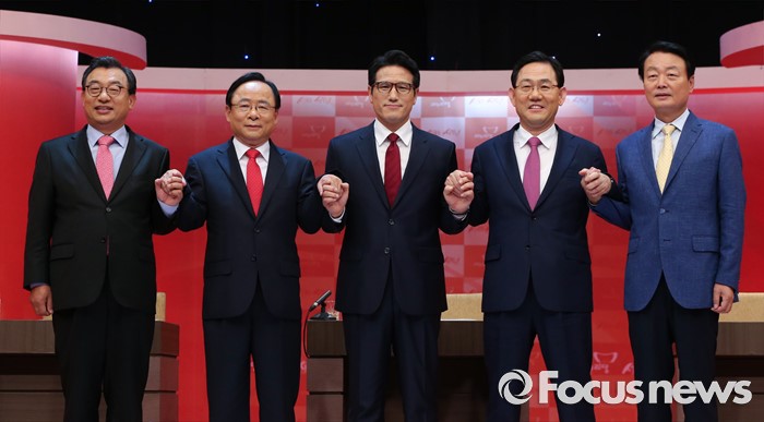 (서울=포커스뉴스) 4일 오후 서울 강서구 등촌동 SBS공개홀에서 새누리당 대표 경선 4차 TV토론회을 마친 의원들이 포즈를 취하고 있다. 오른쪽부터 한선교, 주호영, 정병국, 이주영, 이정현 의원.