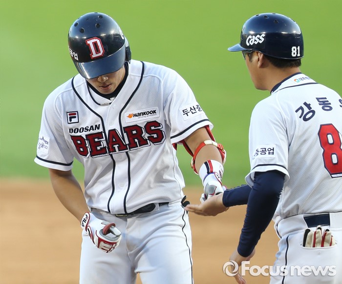 (서울=포커스뉴스) 4일 서울 잠실구장에서 열린 2016 프로야구 LG-두산 경기 2회말 1사 2루에서 두산 허경민이 중전 적시타로 2루주자를 불러 들이고 1루에서 강동우 코치와 손을 마주치고 있다.