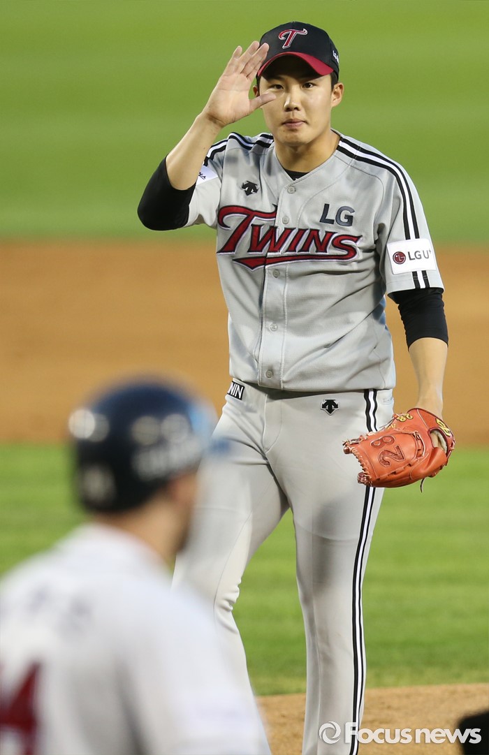 (서울=포커스뉴스) 4일 서울 잠실구장에서 열린 2016 프로야구 LG-두산 경기 4회말 LG 투수 임찬규가 자신의 투구에 맞고 출루하는 두산 에반스에게 사과의 사인을 보내고 있다.