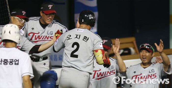 (서울=포커스뉴스) 4일 서울 잠실구장에서 열린 2016 프로야구 LG-두산 경기 연장 10회초 1사후 LG 오지환이 좌월 솔로 홈런을 치고 더그아웃에서 양상문 감독을 비롯한 코칭스탭의 열렬한 환영을 받고 있다.