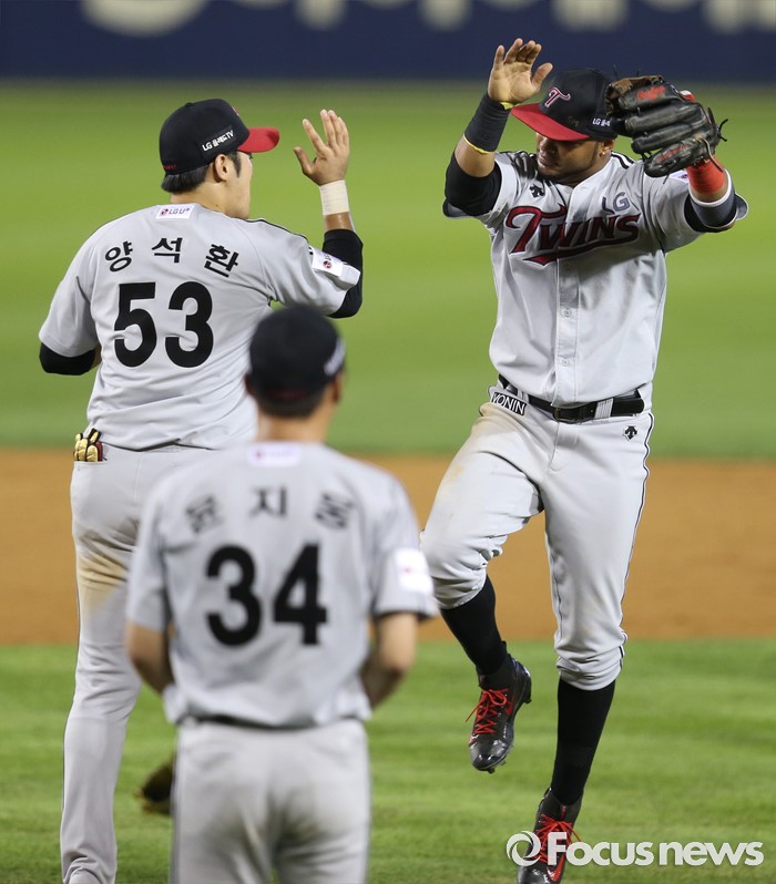 (서울=포커스뉴스) 4일 서울 잠실구장에서 열린 2016 프로야구 LG-두산 경기에서 두산을 연장 12회에 물리친 LG 히메네스와 양석환이 점프해서 몸을 부딪히며 기뻐하고 있다.