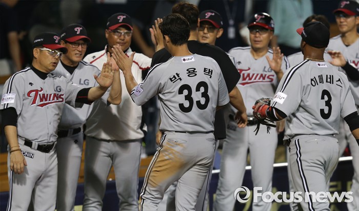 (서울=포커스뉴스) 4일 서울 잠실구장에서 열린 2016 프로야구 LG-두산 경기에서 두산을 연장 12회에 물리친 LG 선수들이 코칭 스탭과 하이파이브하고 있다.