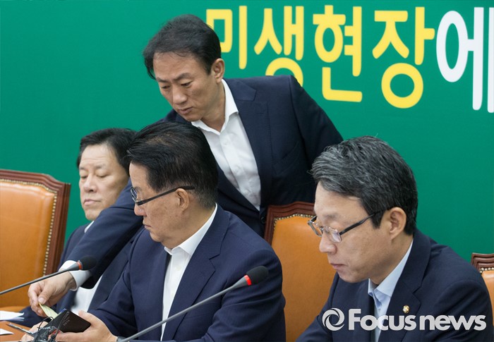 (서울=포커스뉴스) 5일 오전 서울 여의도 국회에서 열린 국민의당 비상대책위원회에 참석한 박지원(가운데) 비상대책위원장이 김명진 비서실장으로부터 메모를 전달받고 있다.