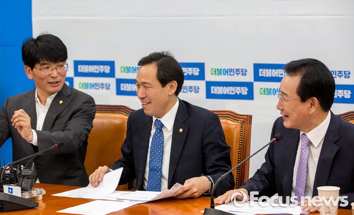 (서울=포커스뉴스) 우상호(가운데) 더불어민주당 원내대표와 변재일(오른쪽) 정책위의장, 박완주 원내수석부대표가 5일 오전 서울 여의도 국회에서 열린 상임위원회 간사단 간담회에 참석해 대화 하고 있다.