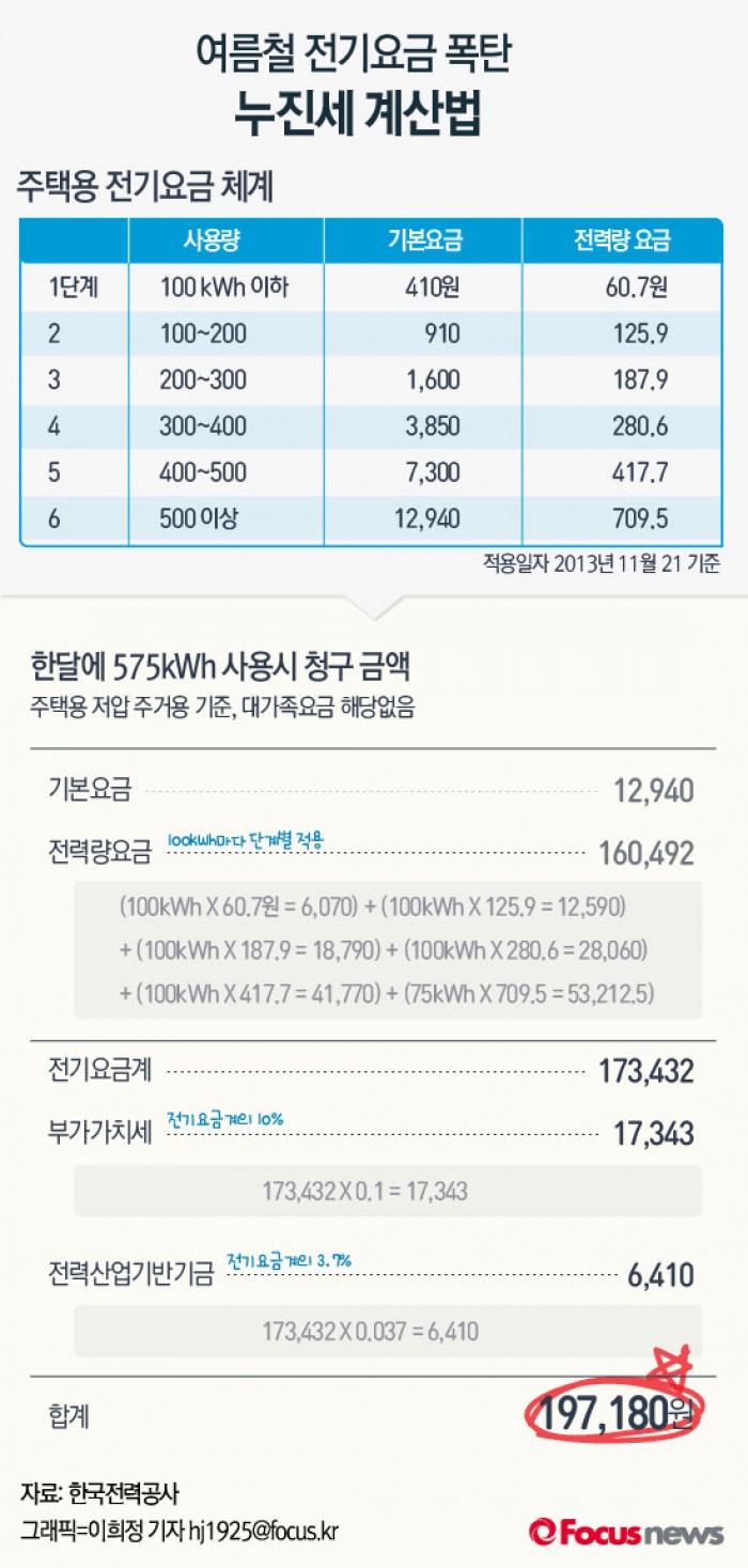 (서울=포커스뉴스) 역대급 폭염이 계속되고 있는 가운데 전기요금 누진세로 인한 전기요금 폭탄을 우려하는 가정이 늘고있다. 국내 가정용 전기요금 누진세는 6단계이며 1단계와 6단계의 요금이 약 11.7배 차이 난다.