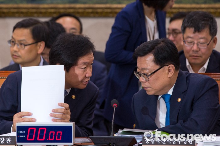 (서울=포커스뉴스) 김영석(왼쪽) 해양수산부 장관과 이동필 농림축산식품부 장관이 5일 오전 서울 여의도 국회에서 열린 국회 농림축산식품해양수산위원회 전체회의에 참석해 대화 하고 있다.