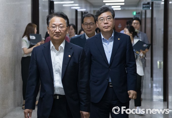 (서울=포커스뉴스) 5일 오전 서울 여의도 국회에서 추경 예산 등 협조를 위해 방문한 유일호(왼쪽) 경제부총리 겸 기획재정부 장관과 송언석 2차관이 여야 지도부를 만나기 위해 이동하고 있다.