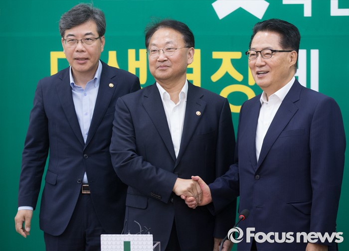 (서울=포커스뉴스) 5일 오전 서울 여의도 국회에서 추경 예산 등 협조를 위해 방문한 유일호(가운데) 경제부총리 겸 기획재정부 장관, 송언석(왼쪽) 2차관이 박지원 국민의당 비상대책위원장과 인사하고 있다.