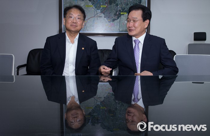 (서울=포커스뉴스) 5일 오전 서울 여의도 국회 의원회관에서 추경 예산 등 협조를 위해 방문한 유일호(왼쪽) 경제부총리 겸 기획재정부 장관이 변재일 더불어민주당 정책위의장과 만나 면담을 하고 있다.
