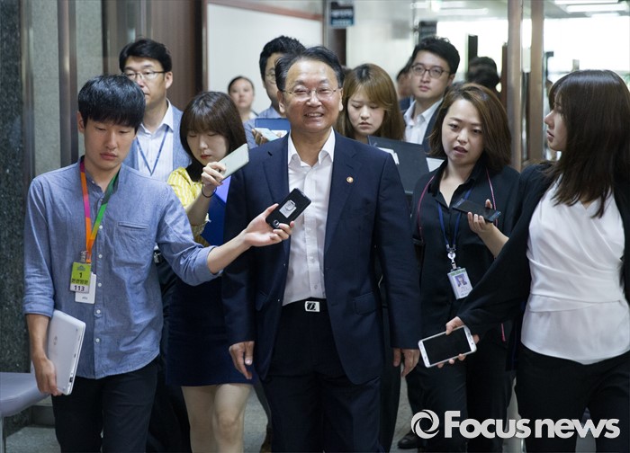 (서울=포커스뉴스) 5일 오전 서울 여의도 국회에서 추경 예산 등 협조를 위해 방문한 유일호 경제부총리 겸 기획재정부 장관이 여야 지도부를 만나기 위해 이동하고 있다.