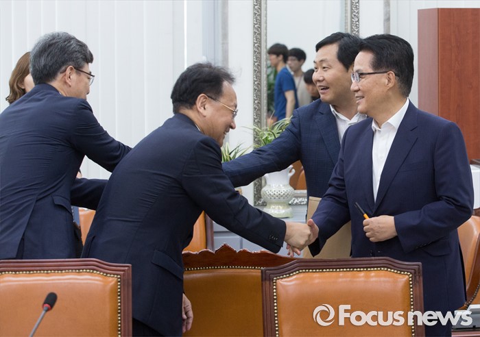 (서울=포커스뉴스) 5일 오전 서울 여의도 국회에서 추경 예산 등 협조를 위해 방문한 유일호 경제부총리 겸 기획재정부 장관과 송언석 2차관이 박지원 국민의당 비상대책위원장, 김관영 원내수석부대표와 인사하고 있다.