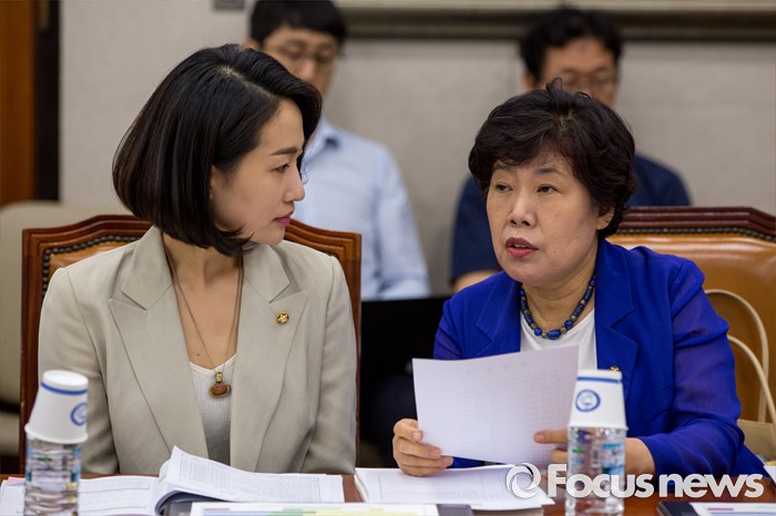 (서울=포커스뉴스) 김수민(왼쪽) 국민의당 의원과 조배숙 국민의당 의원이 5일 오전 서울 여의도 국회에서 열린 산업통상자원위원회 전체회의에 참석해 대화 하고 있다.
