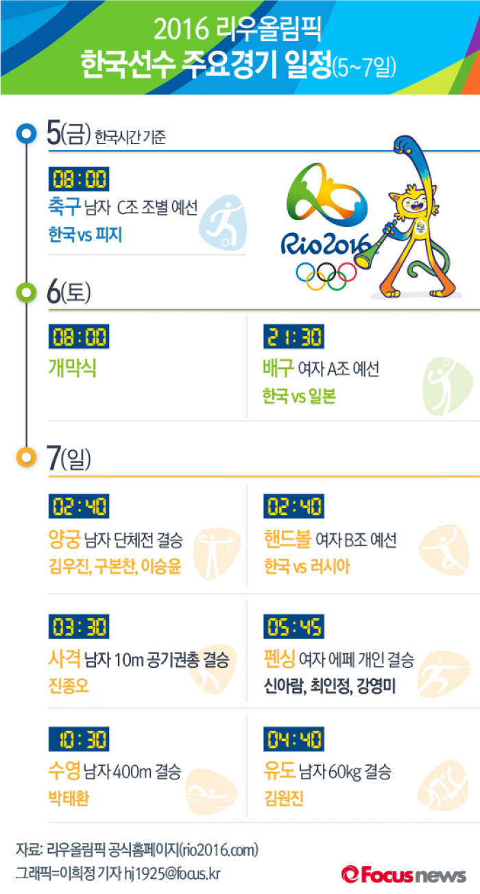 (서울=포커스뉴스) 남미 최초로 개최되는 리우올림픽이 눈앞으로 다가왔다. 2016 리우올림픽 5~7일 한국선수 주요경기 일정.