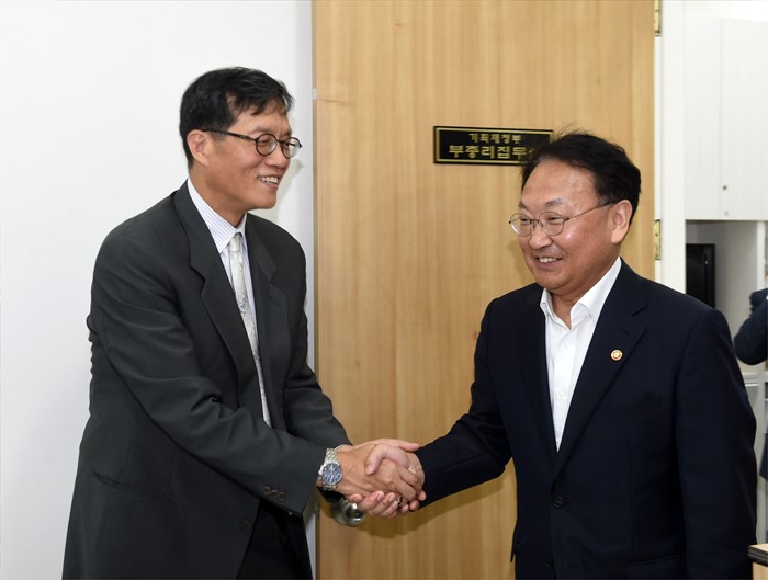 (서울=포커스뉴스) 유일호(오른쪽) 부총리 겸 기획재정부 장관이 5일 서울 여의도 국회에서 이창용 IMF 아.태 국장과 면담에 앞서 악수하며 인사를 나누고 있다. <사진제공=기획재정부>