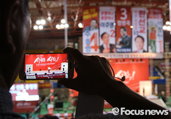 (천안=포커스뉴스) 5일 오후 충남 천안시 유관순체육관에서 열린 새누리당 대표 및 최고위원 선출 충청권 합동연설회에서 당원이 핸드폰으로 촬영을 하고 있다.