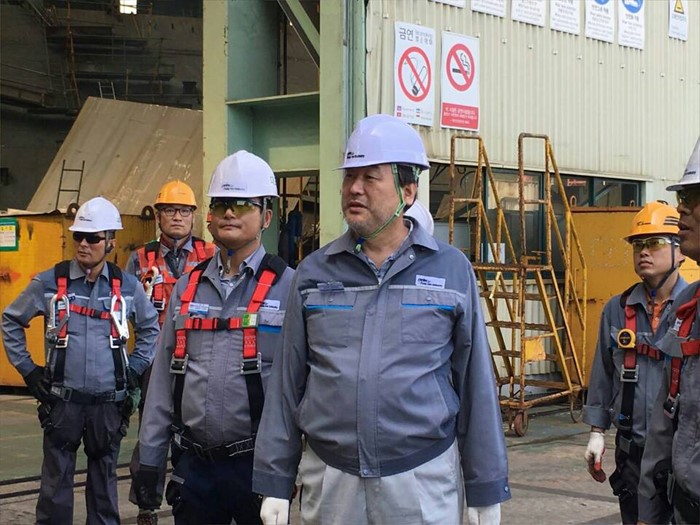 (서울=포커스뉴스) 전국 민생투어 중인 김무성 새누리당 전 대표가 5일 경남 거제시에 위치한 조선사 협력업체 현장을 방문해 둘러보고 있다. <사진제공=김무성 전 대표 페이스북>