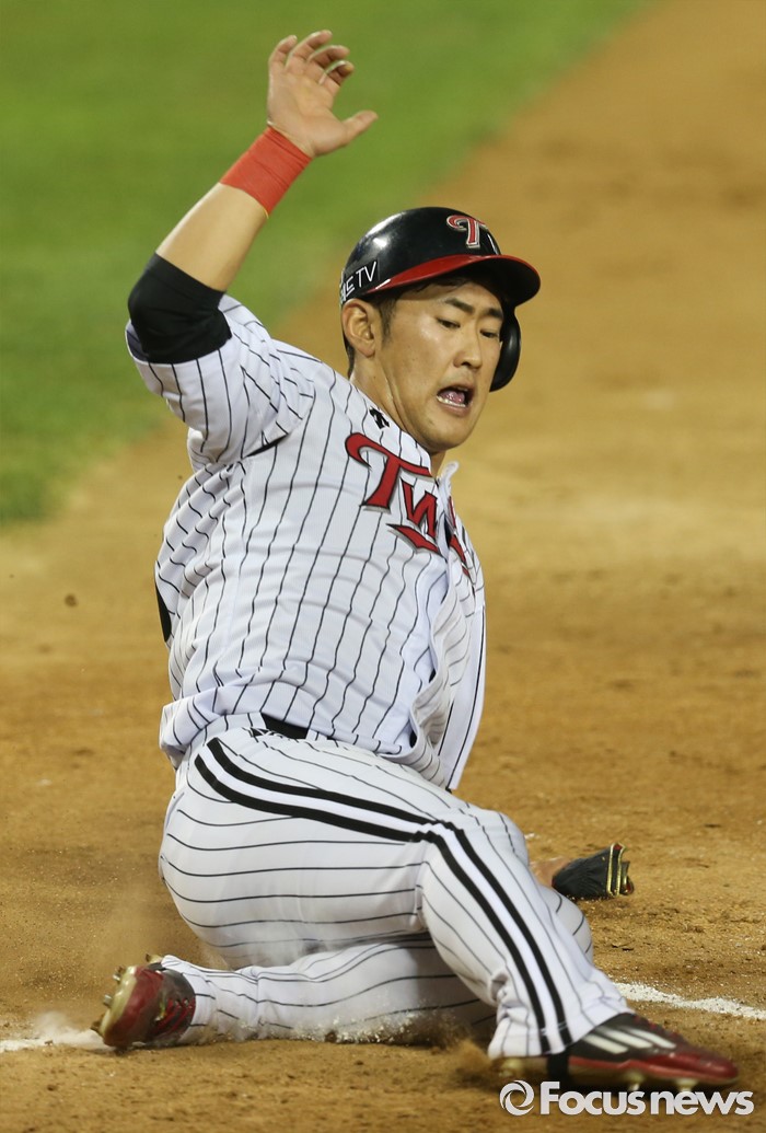 | △ 홈슬라이딩하는 LG 정주현 |