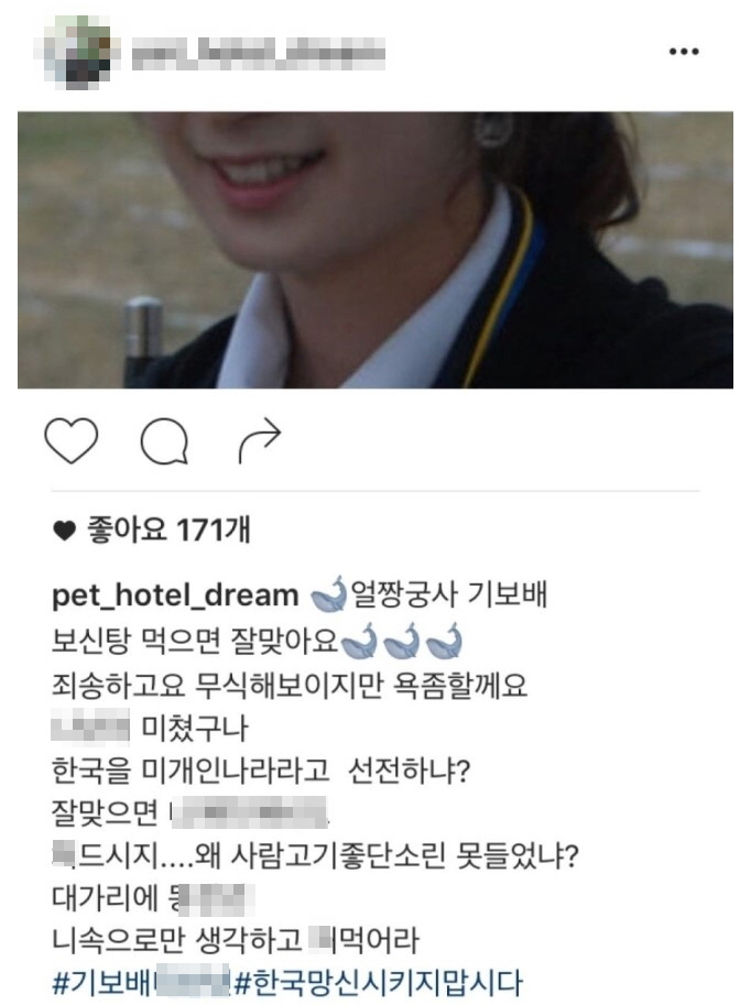 이에 누리꾼들은 "자식의 얼굴에 먹칠을 하고 있다", "동물을 사랑하면 한 사람을 그렇게 공개적으로 비난해도 되는 것이냐", "남에게 저주스러운 말을 퍼붓는 것이 동물을 사랑하는 마음과 모순되는 것 같다" 등 비난의 글을 정씨의 인스타그램에 줄이어 게재했다.