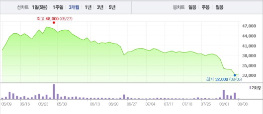 이는 일주일 전 주가인 1일(3만7050원)과 비교했을 때 12.55% 떨어진 수치다.