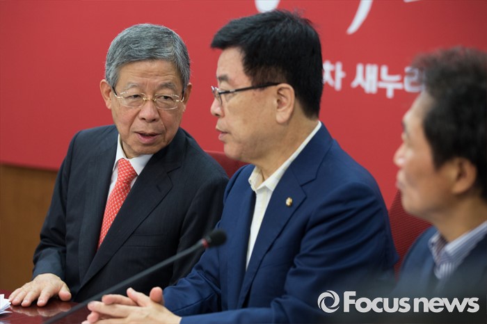 (서울=포커스뉴스) 8일 오전 서울 여의도 새누리당사에서 열린 마지막 혁신비상대책위원회의에서 김희옥(왼쪽) 새누리당 혁신비대위원장과 김광림 정책위의장이 대화하고 있다.
