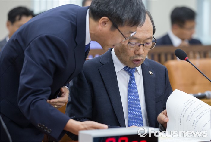 (서울=포커스뉴스) 8일 오후 서울 여의도 국회에서 열린 국방위원회 전체회의에 참석한 장명진 방위사업청장이 관계자와 대화하고 있다.