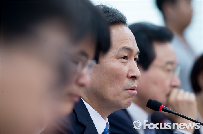 (서울=포커스뉴스) 9일 오전 서울 여의도 국회에서 열린 더불어민주당 원내대책회의에 참석한 우상호 원내대표가 모두발언을 하고 있다.