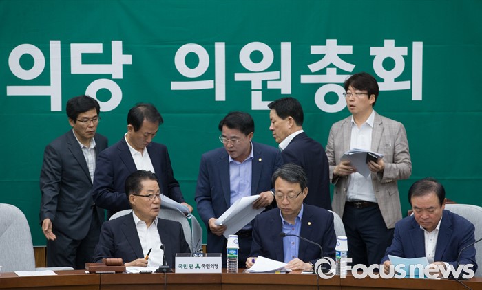 (서울=포커스뉴스) 9일 오전 서울 여의도 국회에서 열린 국민의당 의원총회에 참석한 박지원 비상대책위원장, 김성식 정책위의장, 김명진 비서실장, 최경환, 장병완 의원 등이 대화하고 있다.