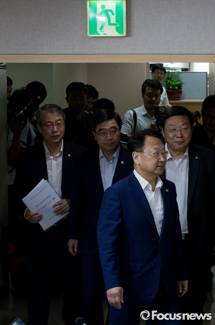 (서울=포커스뉴스) 9일 오전 정부서울청사에서 열린 '2016년 추경예산안 국회 조기통과' 관련 합동브리핑에 참석한 유일호(맨 앞) 경제부총리 겸 기획재정부 장관 및 관계부처 장차관들이 회견장에 들어오고 있다.