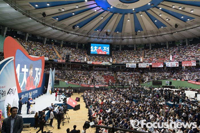 (서울=포커스뉴스) 박근혜 대통령이 9일 오후 서울 송파구 잠실실내체육관에서 제4차 새누리당 전당대회에 참석해 축사를 하고 있다.