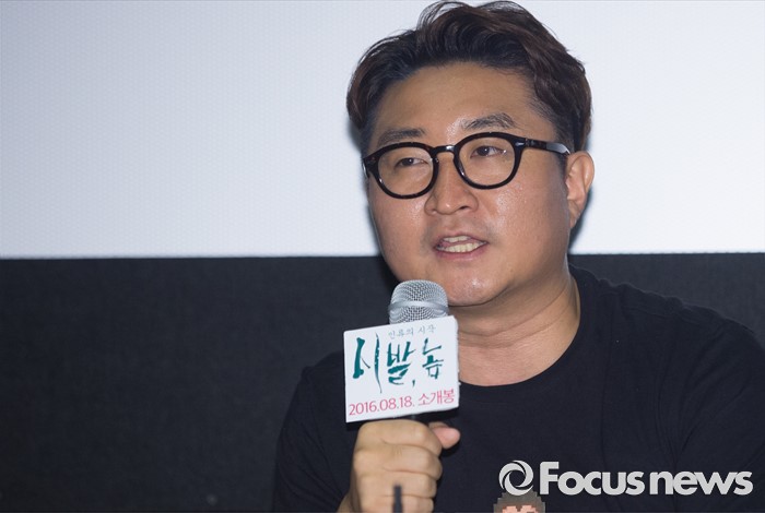 (서울=포커스뉴스) 9일 오후 서울 동작구 아트나인에서 열린 영화 '시발, 놈 : 인류의 시작' 언론시사회에 참석한 백승기 감독이 취재진의 질문에 답하고 있다.
