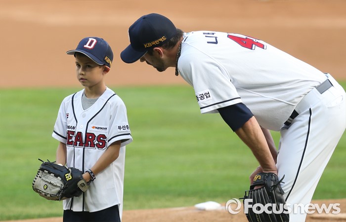 (서울=포커스뉴스) 9일 서울 잠실구장에서 열린 2016 프로야구 KIA-두산 경기에 앞서 두산 투수 니퍼트가 시구자로 나온 아들 케이든과 대화하고 있다.