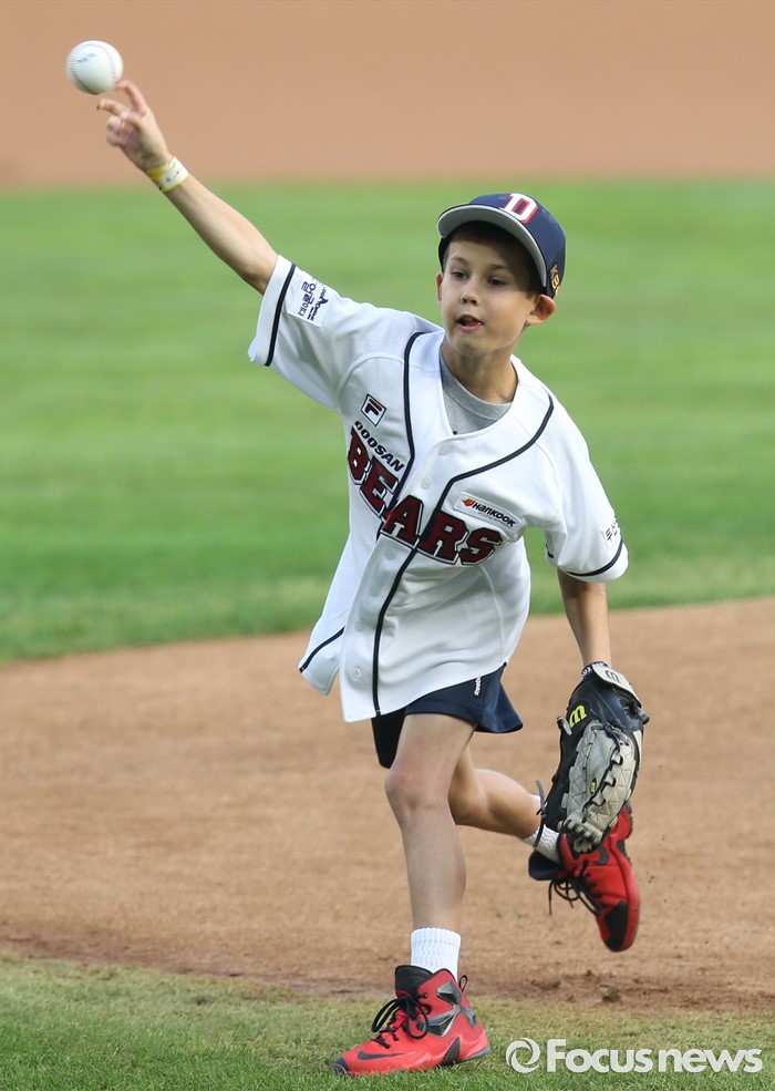 (서울=포커스뉴스) 9일 서울 잠실구장에서 열린 2016 프로야구 KIA-두산 경기에 앞서 두산 투수 니퍼트의 아들 케이든이 시구하고 있다.