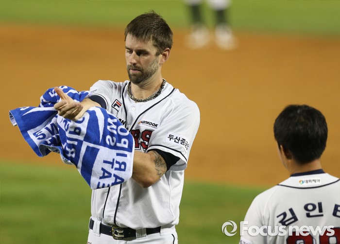 (서울=포커스뉴스) 9일 서울 잠실구장에서 열린 2016 프로야구 KIA-두산 경기 4회초 김풍기 주심의 건강이상으로 주심교체를 위해 경기가 잠시 중단되자 두산 투수 니퍼트가 수건으로 땀을 닦고 있다.