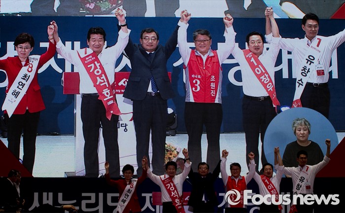 (서울=포커스뉴스) 9일 오후 서울 송파구 잠실실내체육관에서 열린 새누리당 4차 전당대회에서 신임 당대표로 선출된 이정현 의원과 신임 최고위원들이 포즈를 취하고 있다. 왼쪽부터 최연혜, 강석호 신임 최고위원, 이정현 신임 대표, 조원진, 이장우, 유창수 신임 최고위원.