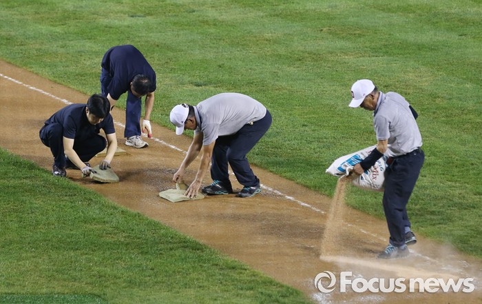(서울=포커스뉴스) 9일 서울 잠실구장에서 열린 2016 프로야구 KIA-두산 경기 6회초가 끝난후 소나기가 내리면서 경기가 중단됐다 비가 그치자 경기장 관리원들이 그라운드의 물을 빼고 마사토를 부으면서 정비하고 있다.