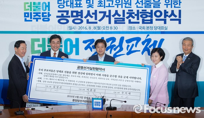 한편, 더민주 당권 주자들은 9일을 시작으로 전국 16개 시·도를 돌면서 합동연설회를 하게 된다. 합동연설회는 11일 울산시당·부산시당, 12일 경북도당·대구시당, 13일 전북도당·광주시당, 16일 전남도당, 17일 충북도당·강원도당, 19일 충남도당·대전시당, 20일 서울시당·인천시당, 21일 경기도당 순으로 열린다.8일 오전 서울 여의도 국회에서 열린 더불어민주당 당대표 및 부문별 최고위원 선출을 위한 공명선거 협약식에 참석한 당대표 후보들이 노웅래 선거관리위원장에게 협약서 서명 후 전달하고 있다. 왼쪽부터 김상곤, 이종걸 당대표 후보, 노 위원장, 추미애 당대표 후보, 김종인 비대위 대표. 2016.08.08 박동욱 기자