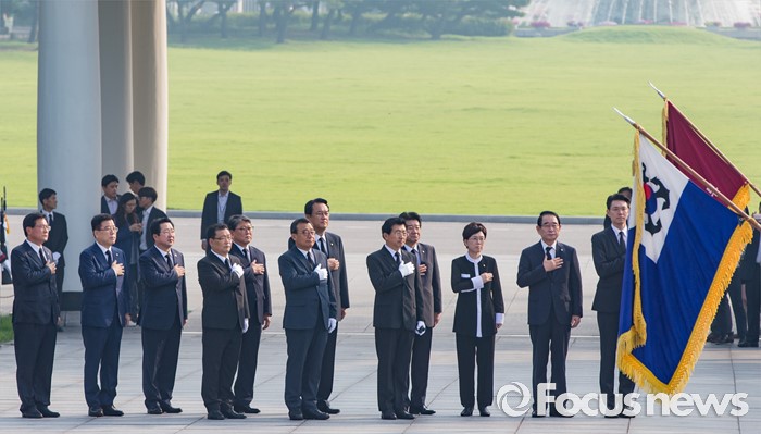 (서울=포커스뉴스) 8·9 전당대회에서 새누리당 대표로 선출된 이정현 대표가정진석 원내대표, 김광림 정책위의장, 박명재 사무총장 및 최고위원 등과 함께 10일 오전 서울 동작구 국립현충원 참배단으로 향하는 도중 국민의례를 하고 있다