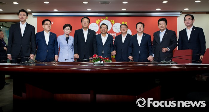 (서울=포커스뉴스) 새누리당 지도부가 10일 오전 서울 여의도 새누리당사에서 열린 최고위원회의에 참석해 회의 시작에 앞서 취재진을 향해 포즈를 취하고 있다. 왼쪽부터 유창수 최고위원, 김광림 정책위의장, 최연혜 최고위원, 정진석 원내대표, 이정현 대표, 조원진 최고위원, 이장우 최고위원, 강석호 최고위원, 박명재 사무총장.
