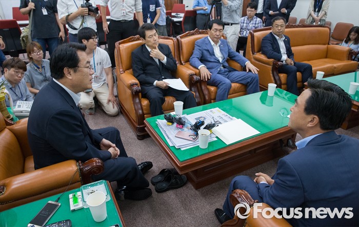 (서울=포커스뉴스) 10일 오전 서울 여의도 국회에서 정진석 새누리당 원내대표가 부정청탁 및 금품등 수수의 금지에 관한 법률(일명 김영란법)과 관련 김태흠 국회 농림축산식품해양수산위원회 간사 등 의원들과 면담을 하고 있다.