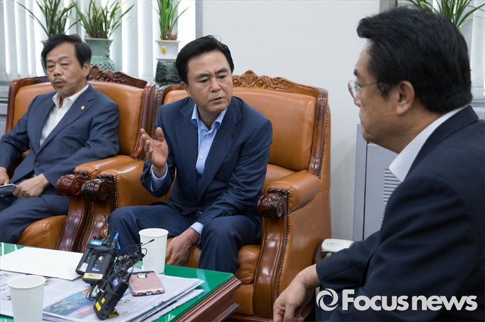 (서울=포커스뉴스) 10일 오전 서울 여의도 국회에서 정진석(오른쪽) 새누리당 원내대표가 부정청탁 및 금품등 수수의 금지에 관한 법률(일명 김영란법)과 관련 김태흠(가운데) 국회 농림축산식품해양수산위원회 간사 등 의원들과 면담을 하고 있다.