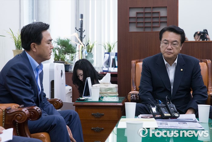 (서울=포커스뉴스) 10일 오전 서울 여의도 국회에서 정진석(오른쪽) 새누리당 원내대표가 부정청탁 및 금품등 수수의 금지에 관한 법률(일명 김영란법)과 관련 김태흠 국회 농림축산식품해양수산위원회 간사 등 의원들과 면담을 하고 있다.
