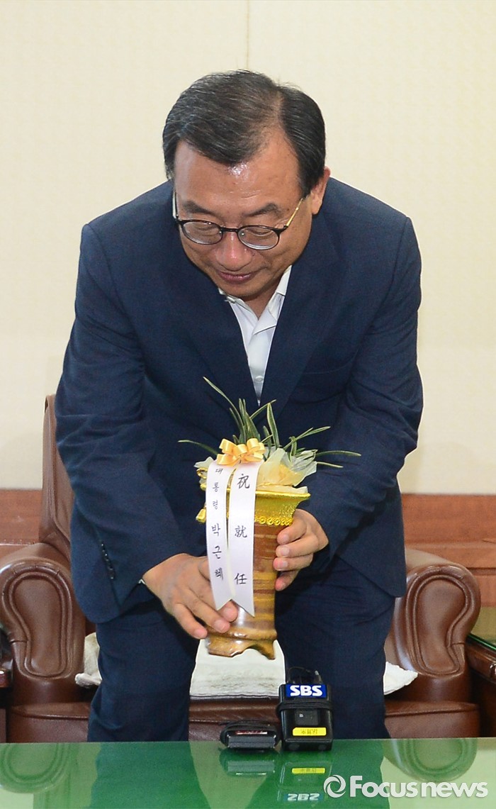 (서울=포커스뉴스) 이정현 새누리당 대표가 10일 오전 서울 여의도 새누리당 당사에서 김재원 청와대 정무수석에게 박근혜 대통령 축하 난을 전달 받은 뒤 탁자 위에 올려 놓고 있다.
