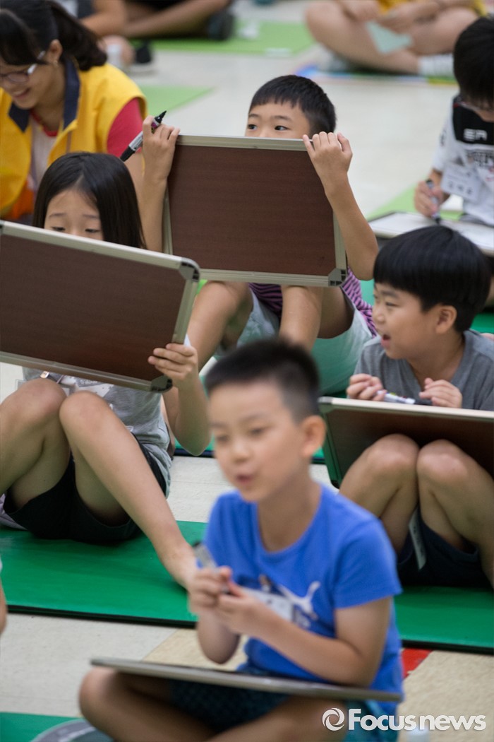 (서울=포커스뉴스) 10일 오전 서울 성동구 성동구청 대강당에서 열린 '성동 어린이 독서 골든벨'에서 초등학생들이 문제를 풀고 있다.
