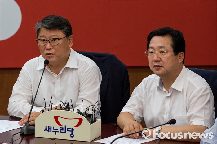 (서울=포커스뉴스) 조원진(왼쪽) 새누리당 최고위원이 10일 오전 서울 여의도 새누리당사에서 열린 최고위원회의에 참석해 모두발언 하고 있다.
