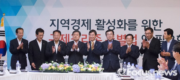 (서울=포커스뉴스) 10일 오후 서울 여의도 국회 사랑재에서 열린 지역경제 활성화를 위한 규제프리존 특별법 왜 필요한가? 간담회에 참석한 유일호 경제부총리 겸 기획재정부 장관과 조경태 기획재정위원장, 허남식 지역발전위원장 및 시도지사들이 기념촬영을 하고 있다. 왼쪽부터 최문순 강원도지사, 이시종 충북도지사, 유 부총리, 허남식 지역발전위원장, 조경태 기재위원장, 서병수 부산시장, 윤장현 광주시장, 우기종 전라남도 정무부지사, 이춘희 세종시장.