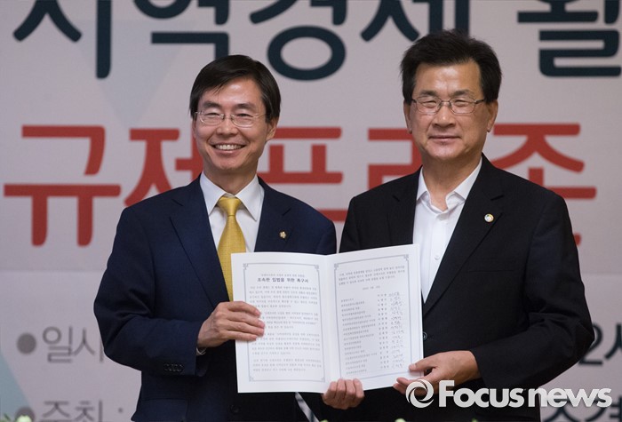 (서울=포커스뉴스) 10일 오후 서울 여의도 국회 사랑재에서 열린 지역경제 활성화를 위한 규제프리존 특별법 왜 필요한가? 간담회에 참석한 조경태(왼쪽) 기획재정위원장이 이시종 충북도지사로부터 조속한 입법 촉구서를 전달받고 있다.