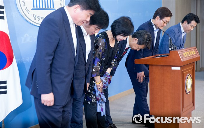 (서울=포커스뉴스) 방중을 마치고 귀국한 더불어민주당 초선 의원들이 10일 오후 서울 여의도 국회 정론관에서 기자회견을 마친 뒤 인사하고 있다. 왼쪽부터 소병훈, 김병욱, 손혜원, 김영호, 신동근, 박정 의원.